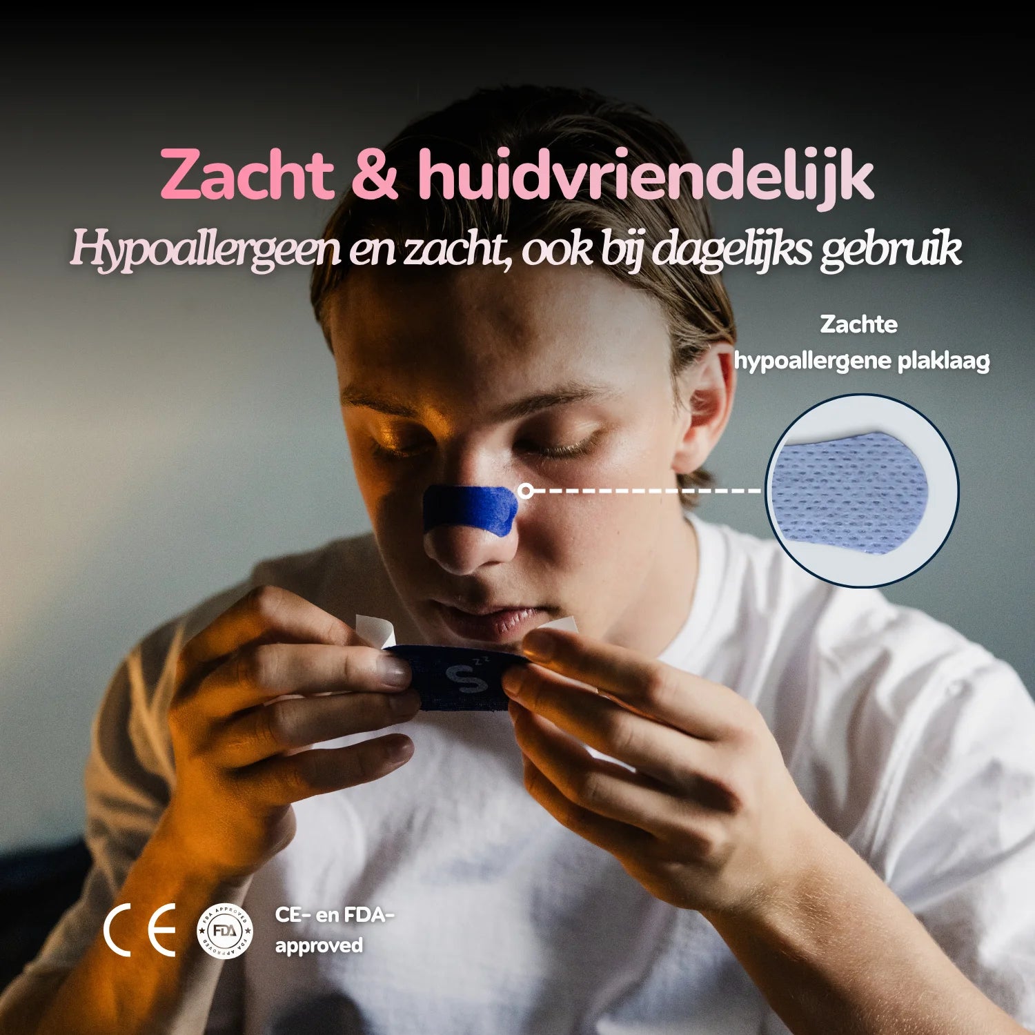 Snoozeless Neusstrips en Mondtape vormen samen de perfecte combinatie voor een betere slaap. De neusstrips openen zachtjes je neusvleugels, waardoor de luchtstroom wordt verbeterd. Tegelijkertijd zorgt de mondtape ervoor dat je mond gesloten blijft, wat neusademhaling stimuleert. Dit duo helpt niet alleen om snurken te verminderen, maar bevordert ook een diepere, meer herstellende slaap.