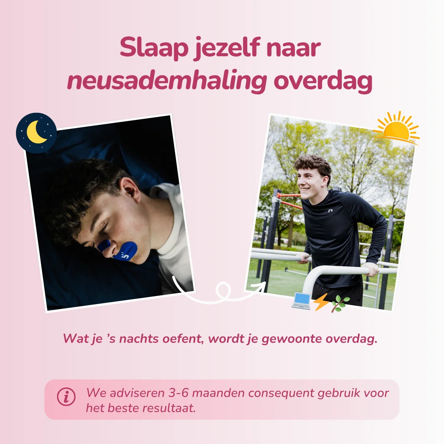 Ja! De neusstrips zijn perfect voor overdag, vooral tijdens sportieve activiteiten, omdat ze meer zuurstof naar je lichaam brengen en prestaties verbeteren. De mondtape is vooral bedoeld voor slaap, maar kan ook helpen bij ademhalingstraining tijdens rustige momenten.