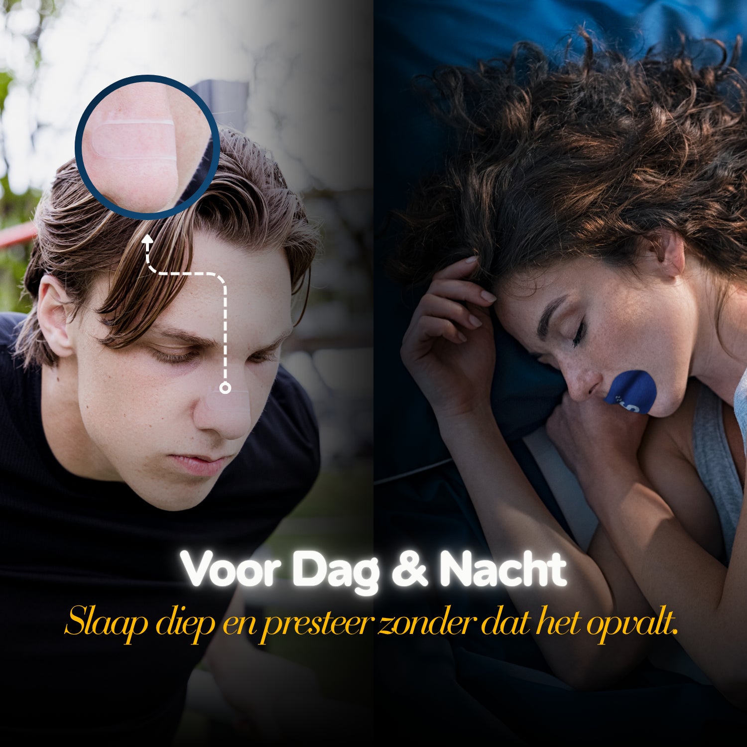 Ja! De neusstrips zijn perfect voor overdag, vooral tijdens sportieve activiteiten, omdat ze meer zuurstof naar je lichaam brengen en prestaties verbeteren. De mondtape is vooral bedoeld voor slaap, maar kan ook helpen bij ademhalingstraining tijdens rustige momenten.